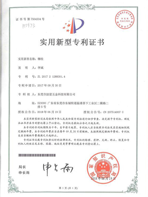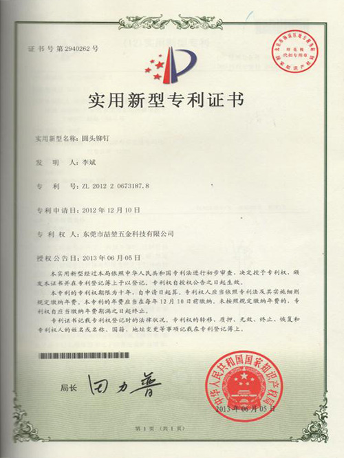 喆堃-圓頭掉頭拉釘實用新型專利證書