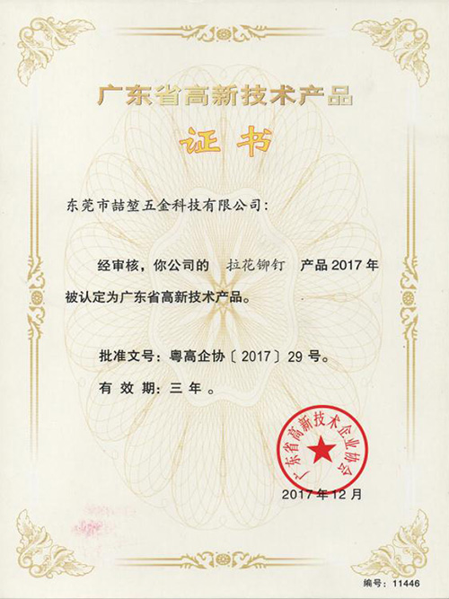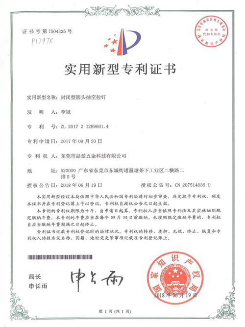喆堃-封閉型沉頭抽空拉釘實用新型專利證書